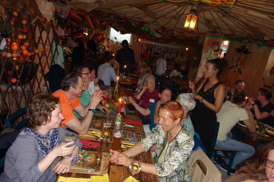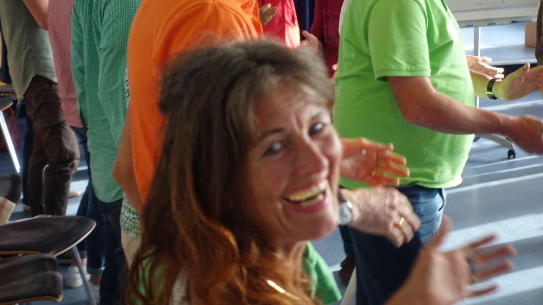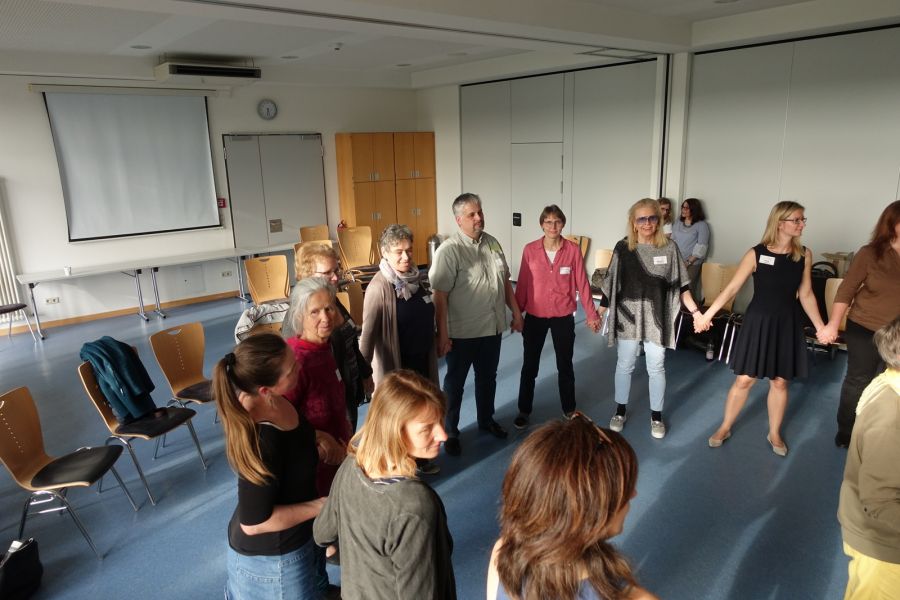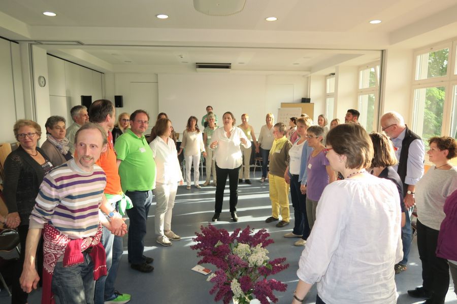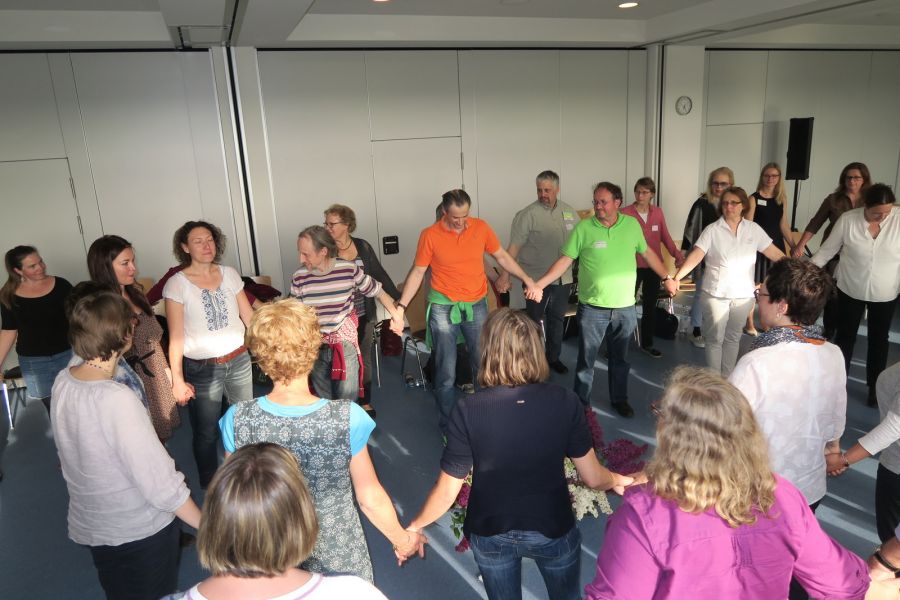 In der Abschlussrunde benannten Teilnehmende und TrainerInnen ihre Eindrücke und ihre Freude über die Bereicherungen des Tages. Gemeinsames Tanzen und Singen ließen alle noch einmal die GFK-Gemeinschaft dieses Tages spüren.