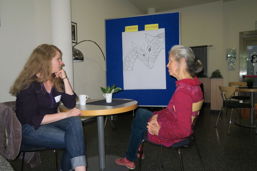 ich so einen Satz höre, welche Bedürfnisse könnten hinter den Worten des anderen stehen?“ Im praktischen Üben zu zweit konnten eigene Reaktionen entdeckt werden, und auch die Selbstempathie dafür erhalten. In der Gesamtgruppe konnte weiter geforscht werden mit dem GFK- Modell der “Wolfs- und Giraffenohren“.